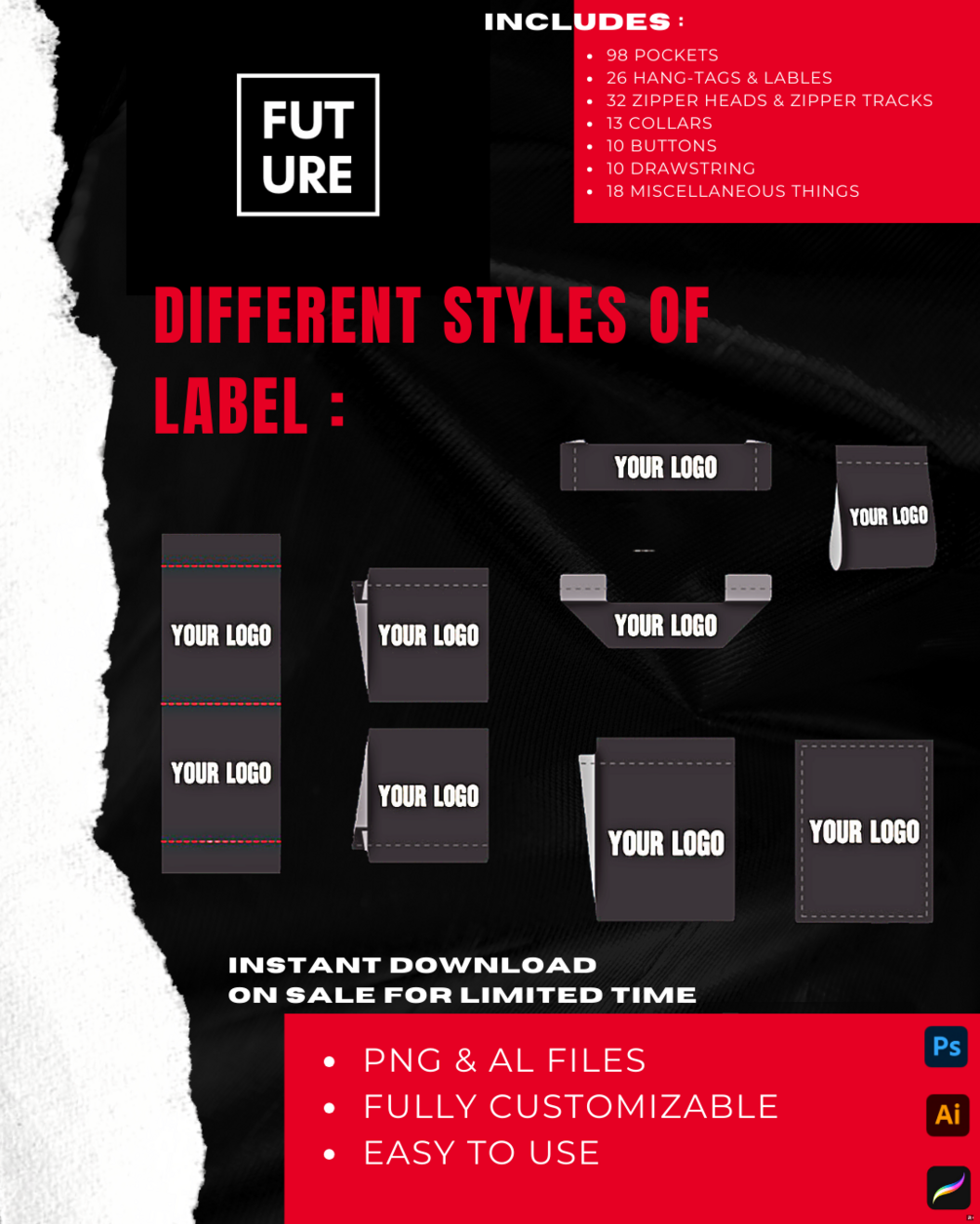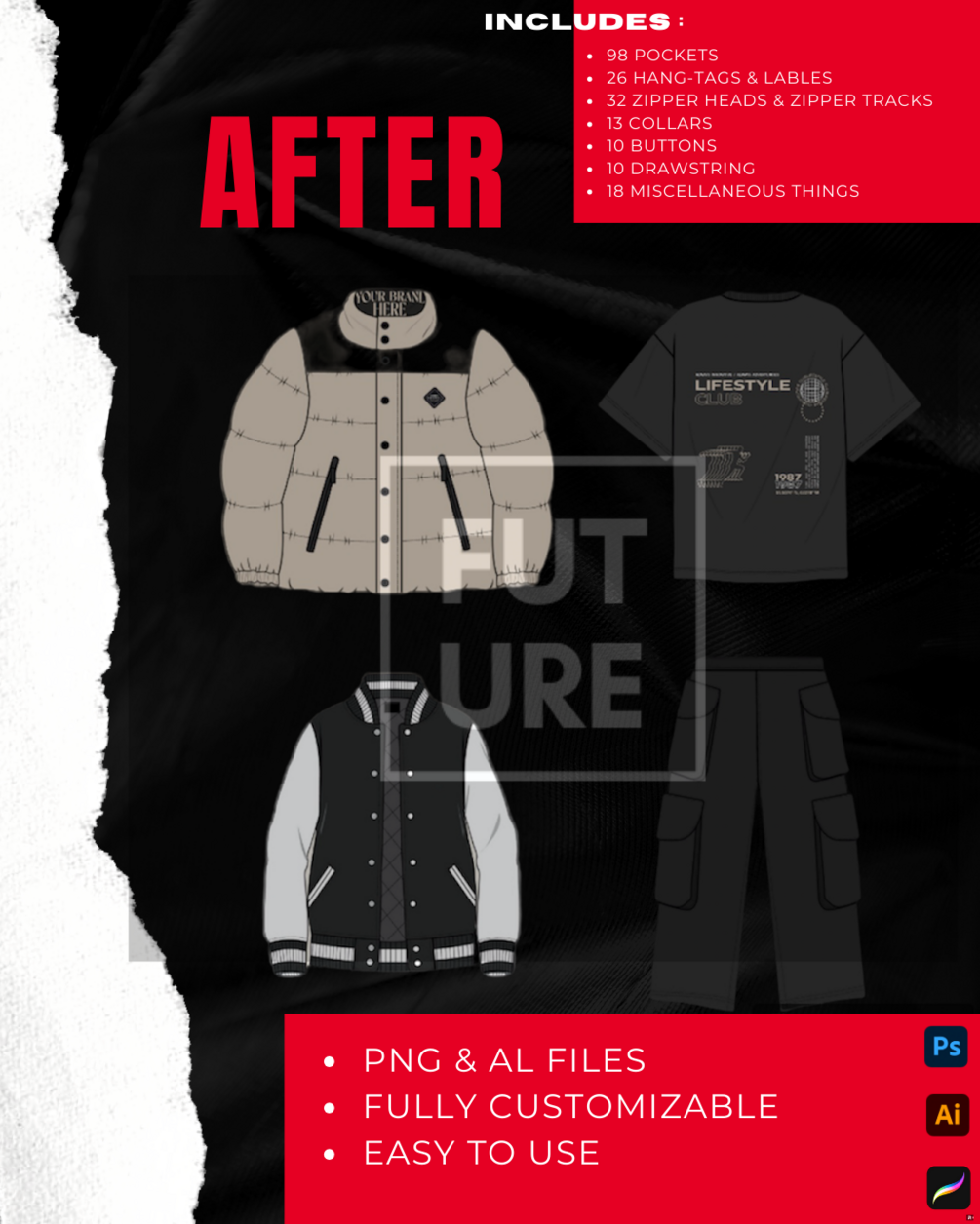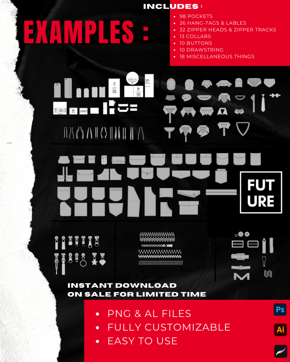 the Mock-Up Attachments pack includes 250 high-quality attachments that are added to your mock-ups to create a more accurate, detailed, and creative mock-up for your techpack to send to your manufacturer